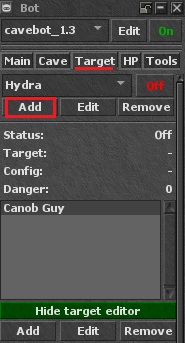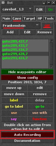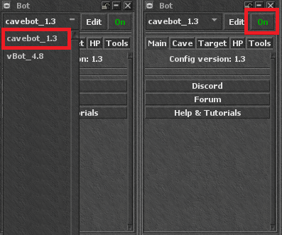 Primero, selecciona "cavebot_1.3". Luego, activa el bot usando el botón Off/On: