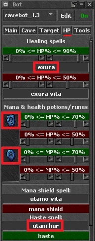 Curación de HP: Primero, ve a la pestaña de HP. Aquí, configuraremos un hechizo de curación. Para nuestro ejemplo, usamos el hechizo "exura", que se activará cuando el HP caiga por debajo del 90%.