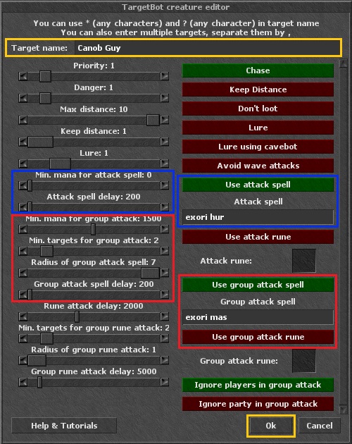 Configuraciones Azules: Establece esto para hechizos específicos de objetivo, como tu hechizo de ataque principal.