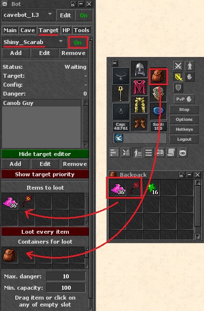 Elige Qué Lootear: Si quieres que tu bot recolecte loot de monstruos específicos como Shiny Scarab